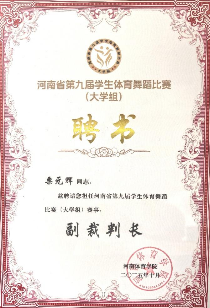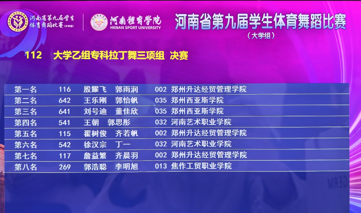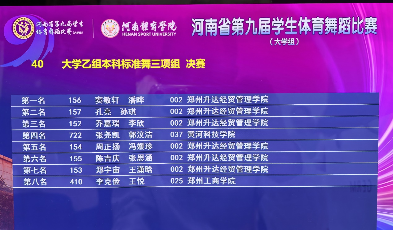 公司体育舞蹈代表队在校领导的关怀和支持下,2025年取得了一系列优异成绩。今年6月份获得了第18届中国老员工体育舞蹈锦标赛的团体总分第一名,10月在河南省教育厅、河南省体育局主办的河南省第九届员工比赛也取得佳绩。本次大赛的特邀裁判长王力强是中国老员工体育舞蹈协会的副秘书长,对公司员工的表现给予了充分的肯定,并鼓励升达学院体育舞蹈代表队多走出去,与全国的高校多交流,不断提升在全国范围的影响和知名度。一竞技体育舞蹈专业师生将继续努力,为创造体育舞蹈一流品牌专业而努力!